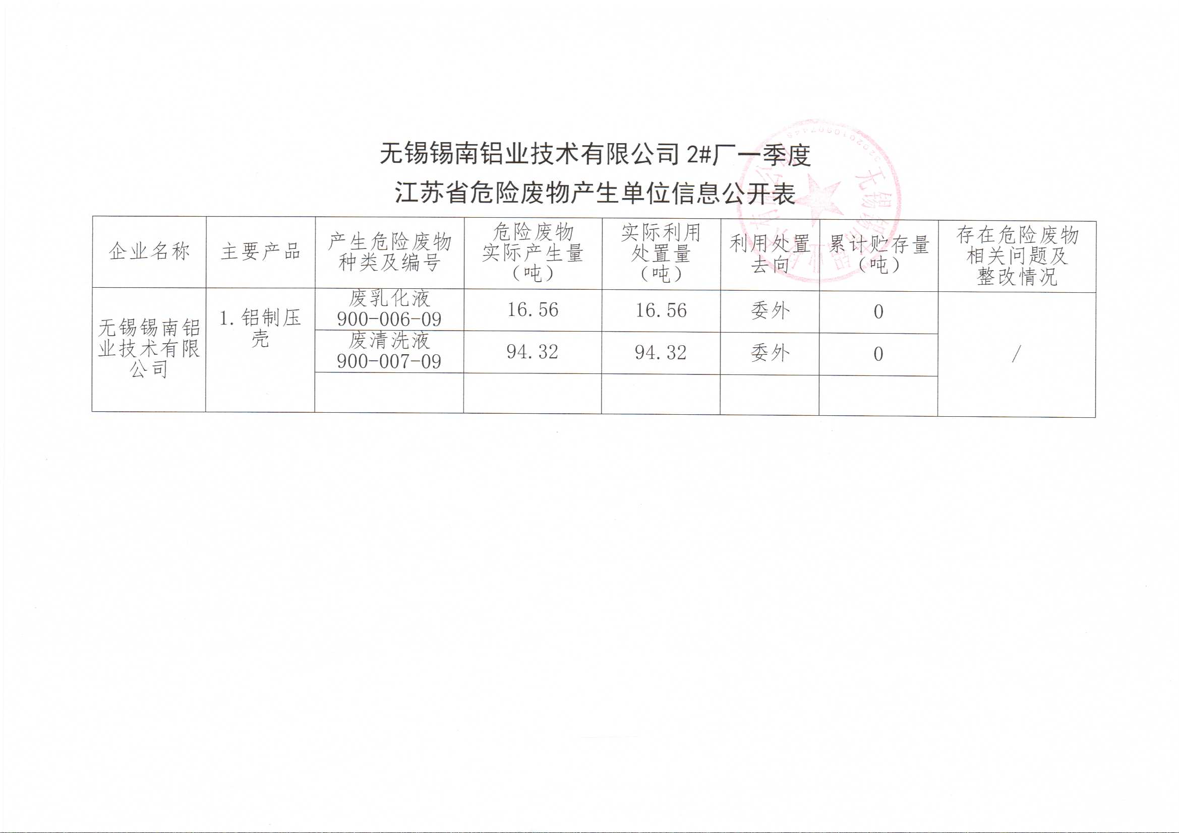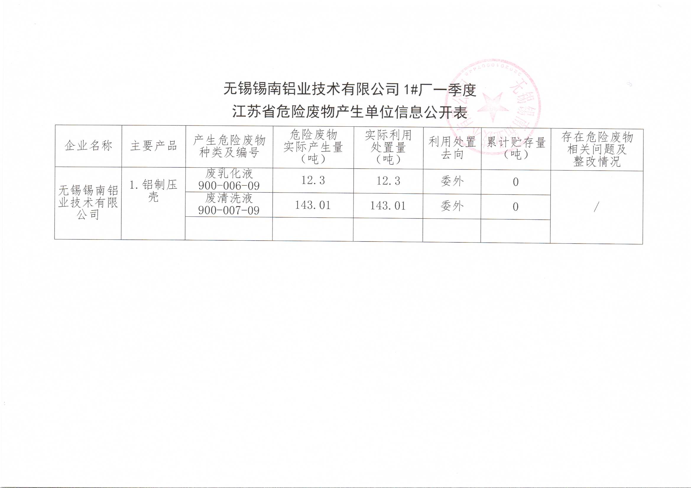 江苏省危险废物产生单位信息公开表(一季度)